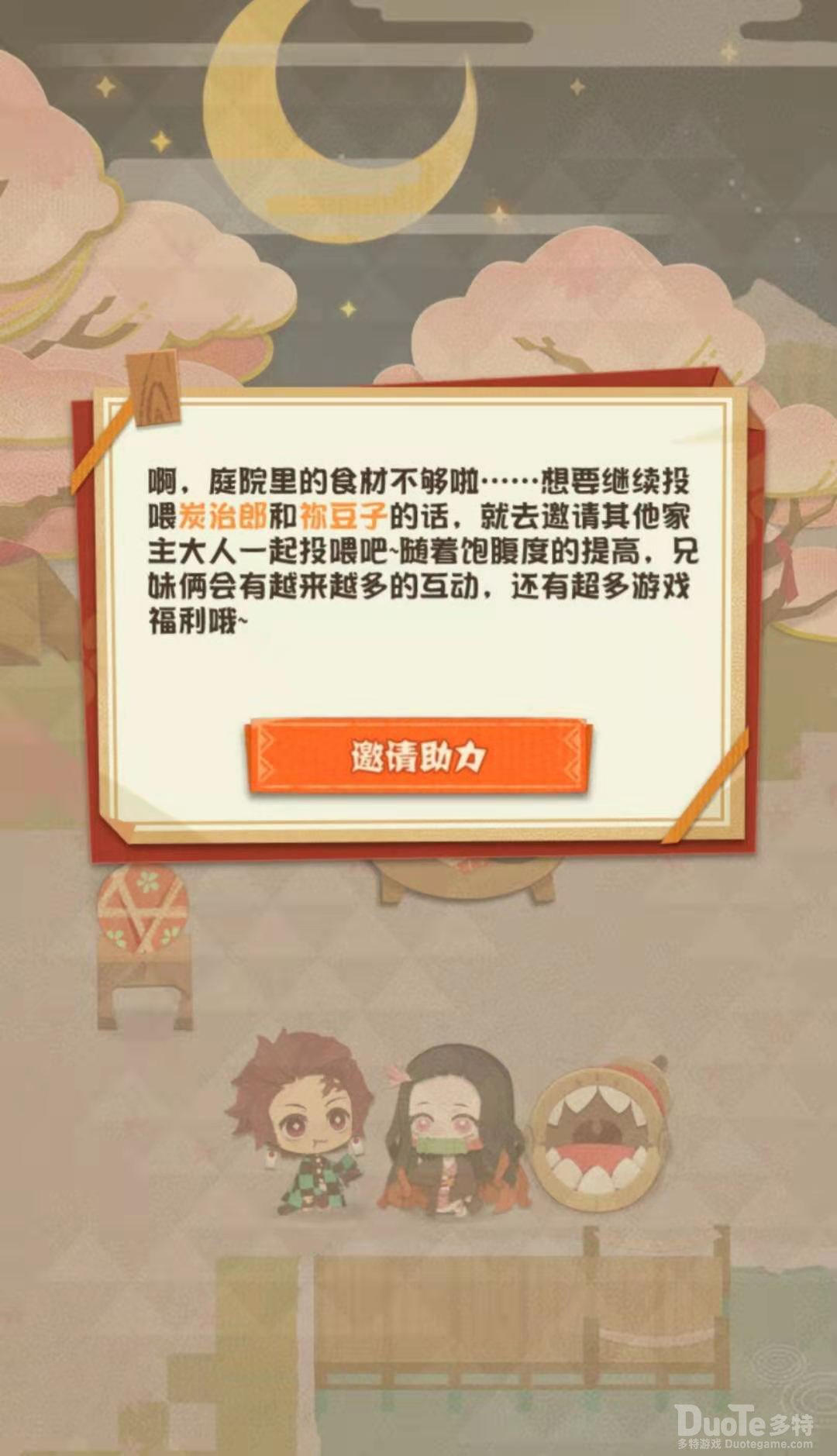 3.投喂结束后,家主根据提示邀请好友一起来助力,继续投喂灶门兄妹。随着各级助力人次的达成,家主将收到对应的游戏礼包,同时还有可能触发特别的互动彩蛋哦~