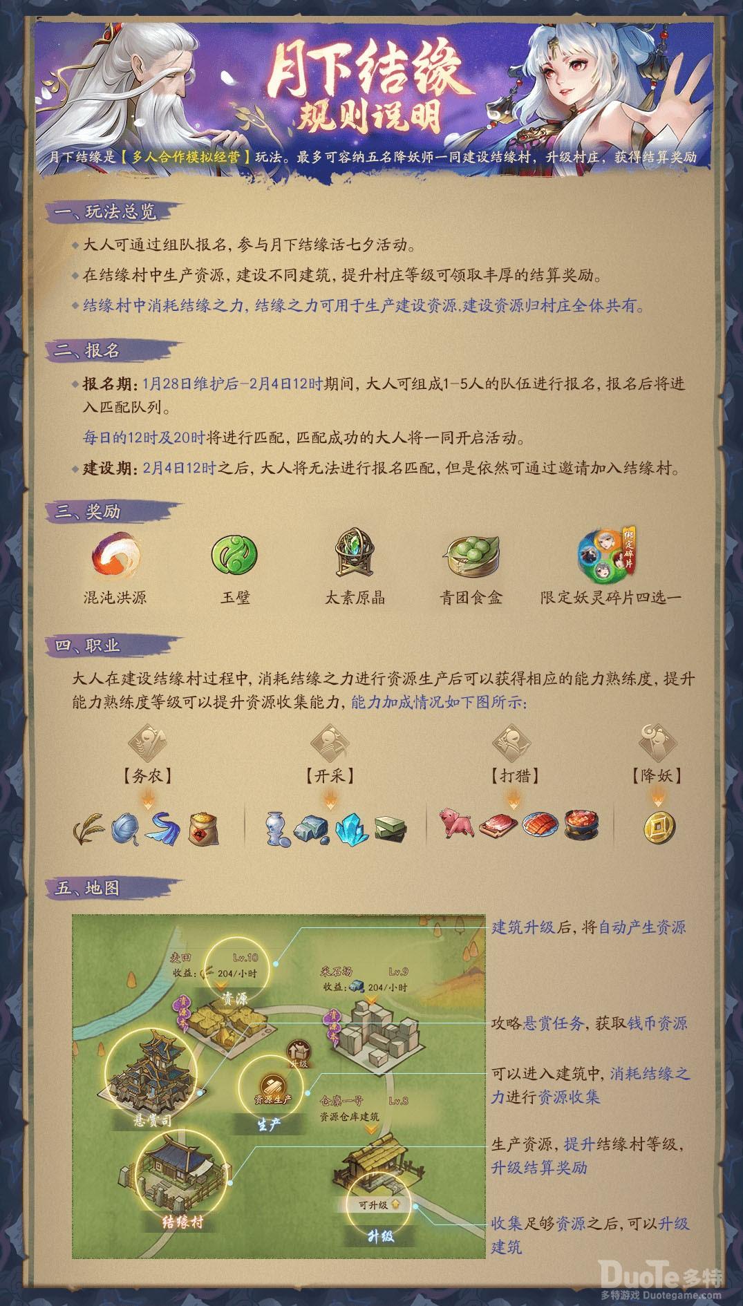 月下结缘 复刻重逢转眼又是小年夜将至,灶君即将朝天言事,凡间也弥漫起过年的气氛,各种民俗活动接连不断,家中杯盘典祀丰盛可喜。不过在“积雷山大寨”与“结缘村”里,村民们还在为了置办年货而苦恼,急需各位降妖师大人的帮助。为了满足村民们的过年需求,“月下结缘话七夕”活动又在年前重新启动,从1月28日维护后至2月4日12时期间,符合参与条件的大人们可以报名匹配参与活动,完成活动任务即可获得“太素原晶”、“混沌洪源”、“玉璧”、“2021春节唤灵符”、“限定妖灵碎片四选一礼盒”等丰富回礼。