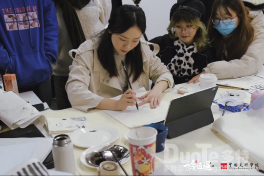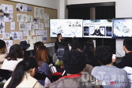 主创分享 回溯水墨修仙世界构建之路课程最后,《一念逍遥》的主创团队也走进校园,与中国美术学院的师生们分享游戏设计实践经验,探讨中国水墨艺术与传统文化元素在游戏中创新运用的方式。他们真诚地分享了游戏研发团队的工作日常,并从策划和美术的角度与同学们分享一款游戏从零开始的制作过程,讲述游戏内容与美术风格的迭代过程,让同学们对游戏研发实践有了更深入的认识。