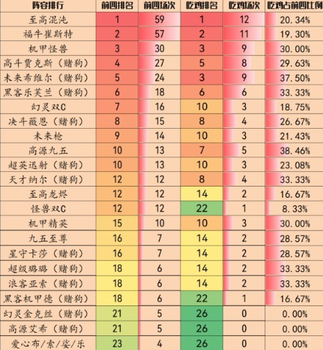 机甲怪兽阵容这周吃分场次30场,吃鸡场次9场,吃分与吃鸡排名都是第3名。阵容吃鸡占前四占比例30%。