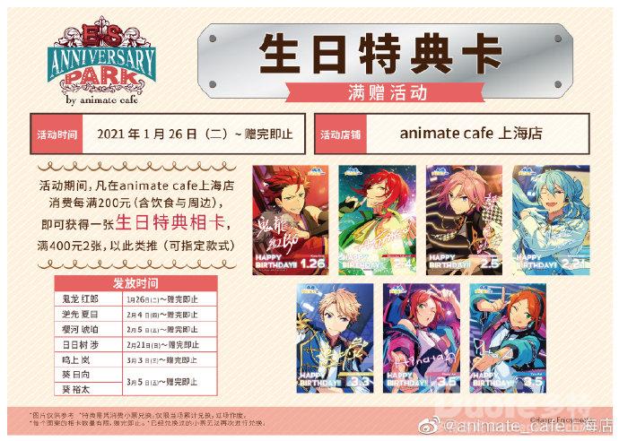 消费满赠活动 限定生日特典卡免费赠活动期间,凡是在主题店消费每满200元,即可获赠一张生日特典相卡,可指定款式。发放的卡片和小偶像们的生日相关,具体发放时间如下:
