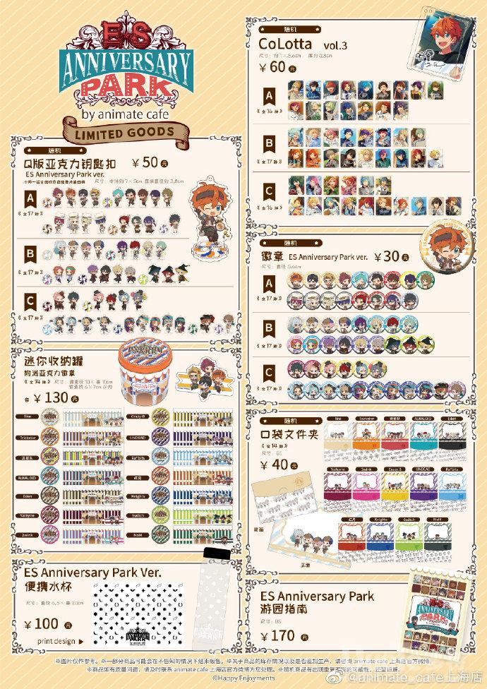 限定周边贩售 把偶像们抱回家在主题咖啡厅,还有多款《偶像梦幻祭2》周边贩售!萌萌的Q版钥匙扣、颜值超高的迷你收纳罐、好看又实用的ES Anniversary Park Ver.水杯、款式超多的的Colotta、经典的徽章……多款周边任你选择,各位制作人们千万不要错过!