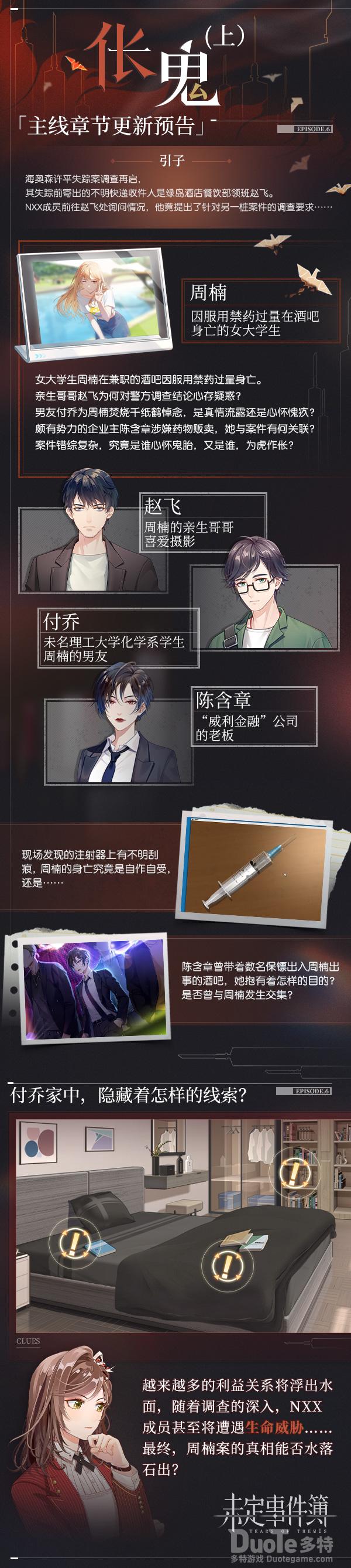 多样人物线索 千丝万缕关系错杂主线第六章《伥鬼》开启在即,《未定事件簿》陆续释出了赵飞、付乔、陈含章三人的人物介绍,为玩家提供了相关人物线索的部分案件背景信息,引起了玩家对人物关系和案件走向的诸多猜测。