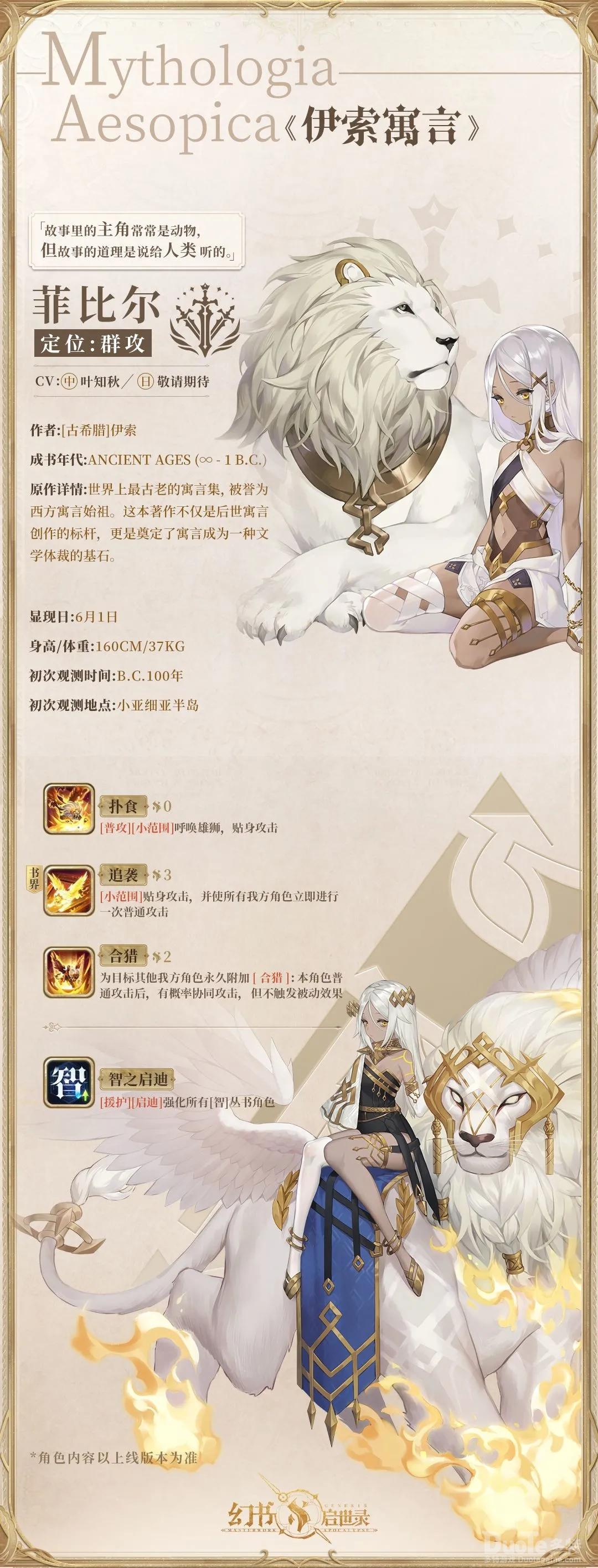 多重世界书拟人手游《幻书启世录》,典藏幻书“伊索寓言”-菲比尔即将入驻阿克夏书馆。她是生于乱世中的奴隶,经历了近千年颠沛流离的生活,最信任的伙伴是名为“赫尔墨斯”的狮子。这位少女不善于表达感情,对陌生人带有天然的警惕心,很难完全信任他人,但是她的内心深处其实同样渴望着阳光与温暖。
