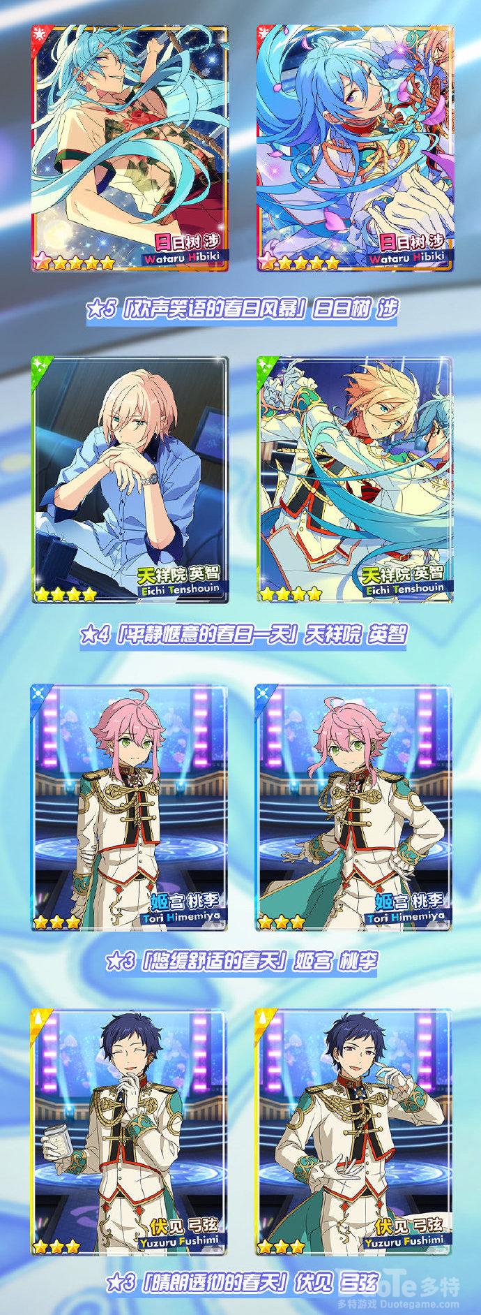 ★5【欢声笑语的春日风暴】日日树涉附带MV服装+房间服装,2次突破附带SCR房间服装,满破附带SCR-MV服装;★4【平静惬意的春日一天】天祥院英智、★3【悠缓舒适的春天】姬宫桃李、★3【晴朗透彻的春天】伏见弓弦均附带MV服装+房间服装。