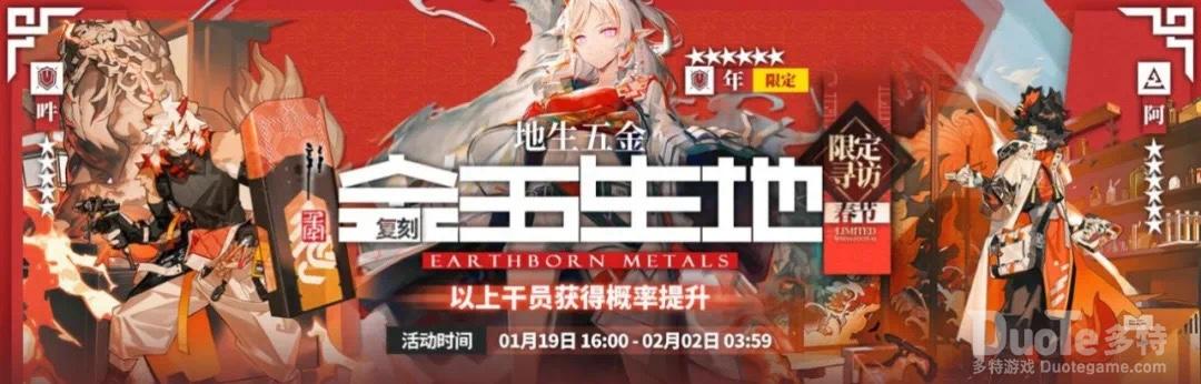 活动说明:活动期间【限定寻访·春节】-【地生五金】复刻寻访开启,该寻访中以下干员出现率上升
