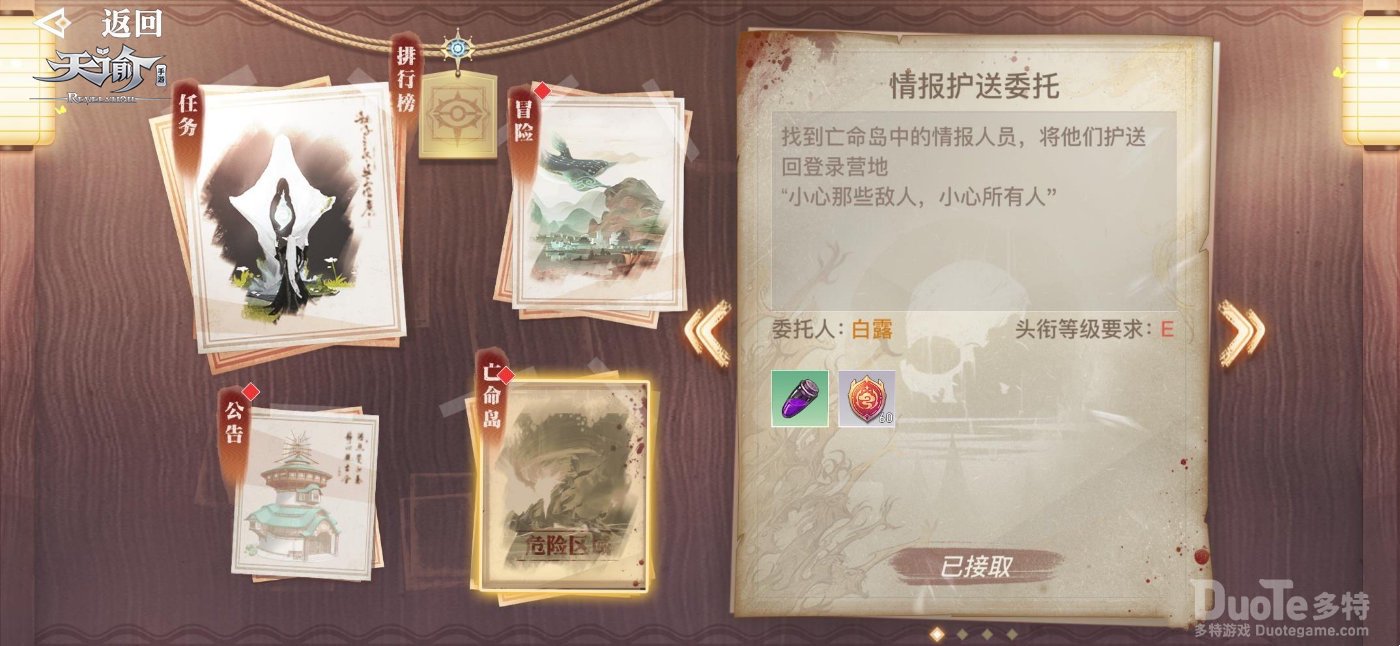 天然战场,诱人委托亡命岛大而荒芜,不受云垂法律的管控。这里是天然的战场。宽敞的环境为冒险家们提供了绝佳的战斗场地,无论是个人恩怨还是帮派纷争都可以在这里解决。另外,具有挑战性的委托使战场不再单调,完成委托的冒险家们还能获得丰富的奖励!
