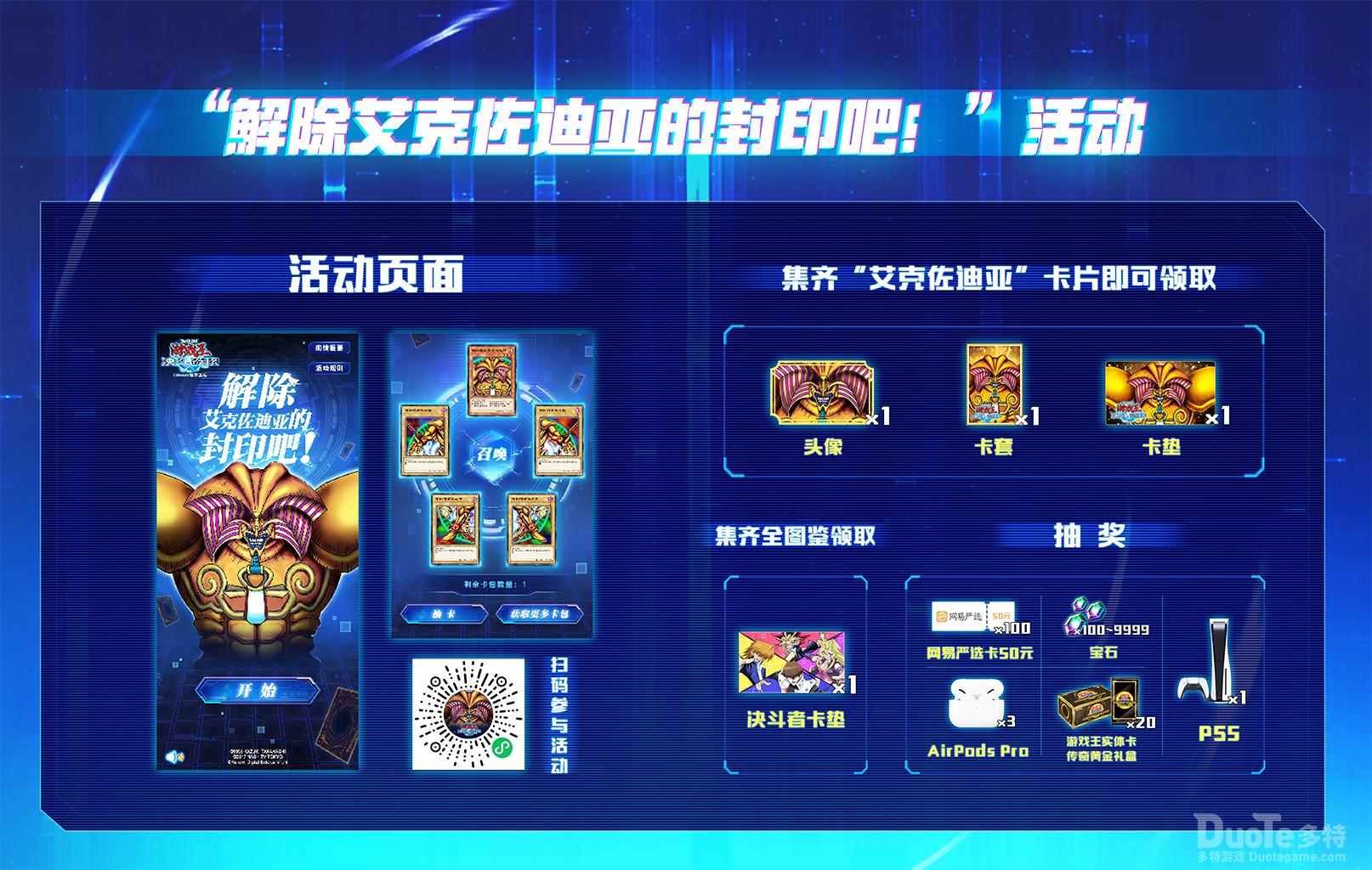 《游戏王:决斗链接》公测福利除上述福利以外,活动【解除艾克佐迪亚的封印吧!】也在火热进行中!集齐5张「被封印的艾克佐迪亚」卡片即可获得限定卡套、卡垫和头像,还有机会获得PS5、AirPods Pro、游戏王OCG传奇黄金礼盒、网易严选卡以及宝石等豪华奖励!立即用微信扫描图上二维码参与活动吧!