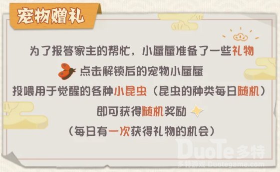 【宠物赠礼】小蜃蜃除了能像其他宠物那样产出木材等资源,还很喜欢吃式神从庭院芦苇丛抓到的觉醒昆虫,每日对其投喂觉醒昆虫能获得随机奖励!