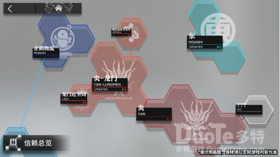 新的关系网络会通过角色所属势力进行划分和区分,通过点击势力可以看到该势力和其相关势力的干员,点击已经获得的干员,可以查看对应干员的详细信息。