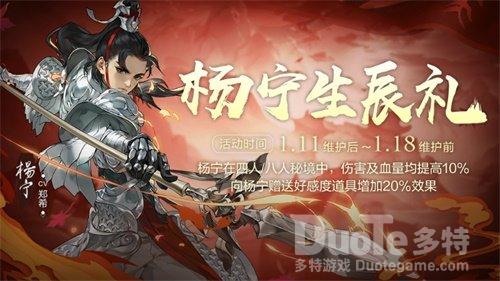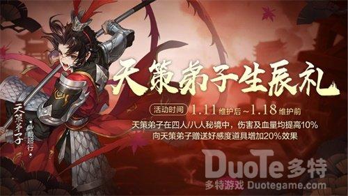 生辰礼活动期间,四人/八人秘境中,【天策弟子】及【杨宁】的伤害及血量将提高10%;活动期间,向【天策弟子】及【杨宁】提交好感度道具,获得的好感度将提升20%。