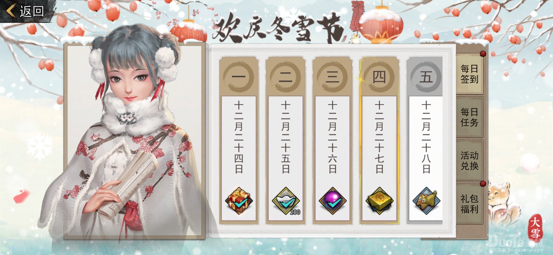 在为期16天的活动中,玩家每天都会迎来五个任务,完成任务即可获得凛寒值以及雪球,可在游戏内兑换奖励。需要注意的是,每天的任务到了第二天0点就会刷新换成新一天的任务,此之前的任务和奖励就没法继续完成和领取。
