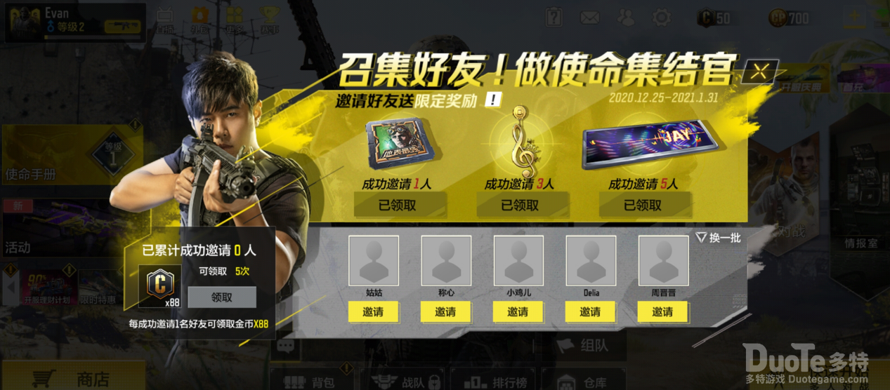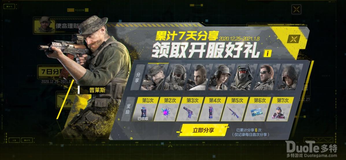 活动期间,玩家分享角色海报,即可激活对应奖励,连续分享七天可解锁全部奖励。烟雾弹-庆典、贴纸-庆典、MW11-庆典、闪光弹-庆典、M16-庆典、中级武器经验卡、突击队员3号-庆典等礼品轻松得。