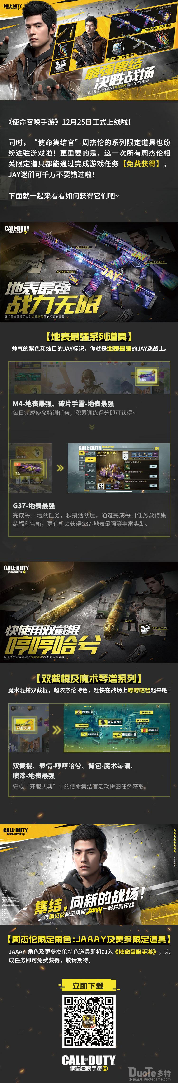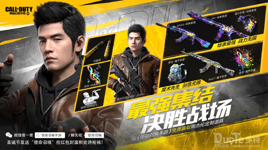 《使命召唤手游》现已震撼上线,周杰伦系列道具免费获取,更有重磅福利助阵。静待战士纵横驰骋,共赴使命之战!