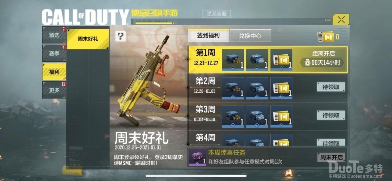 周末登录游戏可以领取金币宝箱、经验卡宝箱和兑换券,周末完成任务额外赠送集结福利宝箱,集齐3张兑换券可兑换史诗级MSMC。