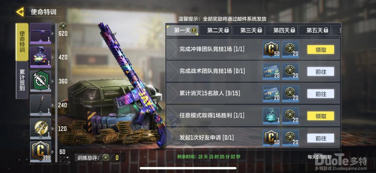 活动期间,玩家登录游戏完成每日的使命特训任务,可获取积分,从而解锁奖励进度,获得对应奖励,M4-地表最强等你来领。