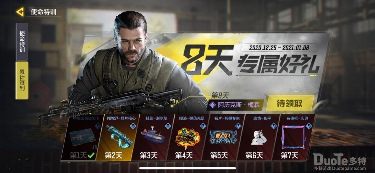 游戏开服后,玩家通过登录游戏即可完成新兵签到,连读登录8天即可解锁对应奖励,签到8天可获得史诗级角色——阿历克斯·梅森。