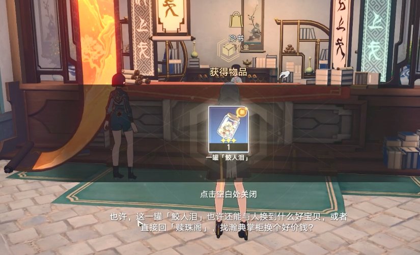 她会送我们一罐【鲛人泪】,再与赎珠坊掌柜交谈过后他会告诉我们,仙舟上有【星际和平公司远道而来的仙舟通】
