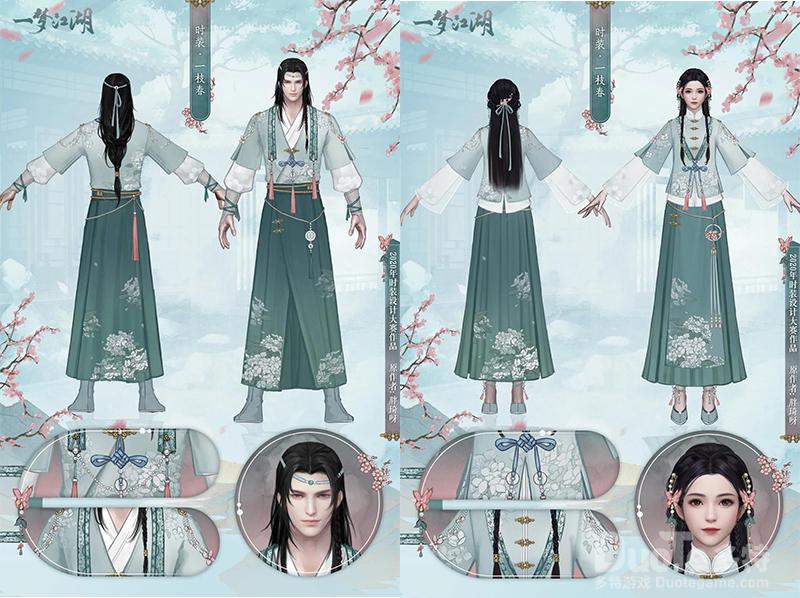 【玩家获奖作品 “一枝春”】一枝春是我们在二周年时举办的“时装设计大赛”中脱颖而出的优秀作品,作者是@胖琦呀 少侠,这套时装以碧青色为主色,轻快的小马褂搭配传统盘口,在低调的色彩中点缀入粉色挂穗与花朵配饰,简洁明了又充满春日的生机与灵动!