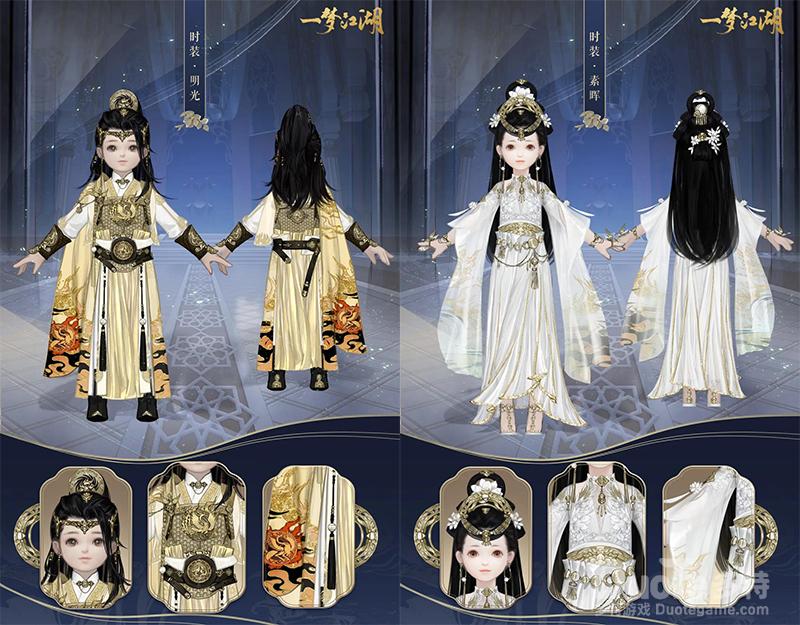 男少侠身披纹饰着赤鸟和烈火的单肩披风,气宇轩昂,同时左胸口的月亮篦梳与少女款的素晖发饰上的篦梳相呼应,寓意童年时的青梅竹马因长大后只能将心意珍藏的故事;女侠则身着白衣细纱,肩膀与胸前布满昙花,裙摆纹饰金绣,袖摆尾端有着一颗象征成男少侠的小太阳,绵绵情意已经被她们珍藏在了衣袖之中。