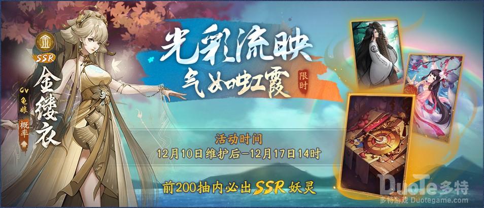 金缕年华,尽显璇宫曼舞今日,金系SSR妖灵“金缕衣”正式开放流光功能,降妖师们可消耗太素原晶为达到三阶以上的金缕衣开启流光功能,为其解锁相应等级的卡面显示效果和属性加成效果。流光效果分为三个级别,级别越高,卡面限时特效和属性加成效果也越出众。