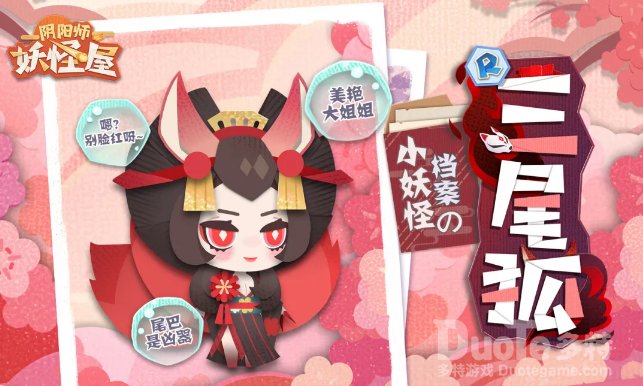听闻庭院里的樱花常年盛开,三尾狐便向小妖怪们问路来到了妖怪屋。外表美艳,言语奔放的她一举一动都散发着魅力,似乎还迷住了不少小妖怪呢~