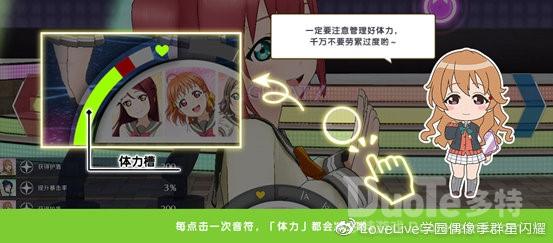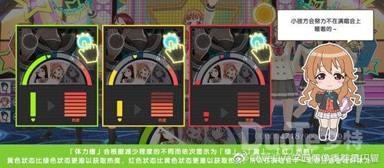 【体力槽】降低后【热度】获取也会相应降低,降低到0后演唱会就失败啦,并且无法获得奖励物品!而保持体力需要使用到相关角色特技进行体力回复,或者完成演唱会中的【表现机会】避免体力大幅减少。