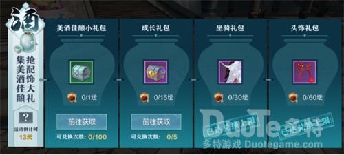 美酒佳酿 开怀畅饮从12月17日5:00至12月31日4:59之间,每天参与日常副本活动即可获得道具璩氏酒,达到一定数量可兑换美酒佳酿小礼包、成长礼包、紫色坐骑礼包、紫色头饰礼包等丰厚奖励。不过要记得有付出才有收获,通过扫荡方式完成副本无法获得道具哦!