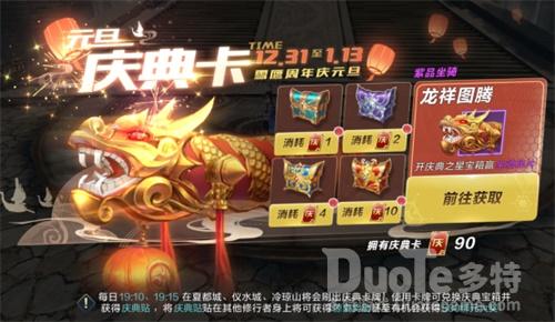 天降庆典 龙祥图腾12月31日至1月13日期间,每天19:10、19:15两个时段会在特定地图刷新出庆典卡牌,采集卡牌达到活动所需数量,即可开启庆典宝箱获得其中奖励。消耗庆典卡牌可开启宝箱并获得“龙祥图腾”碎片和庆典欢乐贴,集齐7个碎片可合成紫品坐骑——龙祥图腾!使用庆典贴和与他人互动并赢取丰厚奖励,幸运者还可获得500绑元超级大礼哦!