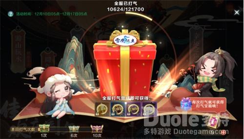 周年礼盒 全民打气在12月10日5:00~12月17日4:59期间,主城夏都城中心会刷出神秘周年礼盒,开启它的钥匙是“打气券”道具,可通过每日首登、每日分享该活动、每日活跃度宝箱获得。使用道具打气完成即可获得宝箱,打开可获得欢乐币、集字道具等物品。修行者每日打气次数达到一定数值便可领取奖励,而全服累积打气次数达到条件则可获得界面显示的大奖。人多力量大,快来为周年庆活动添砖加瓦!
