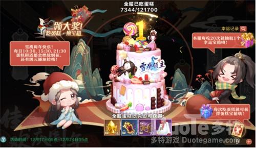 周岁华诞 蛋糕欢庆12月17日5:00~12月24日4:59,快和小伙伴们共享生日蛋糕!修行者们通过每日首登、每日分享该活动、每日活跃度宝箱可获得道具分享蛋糕,吃完蛋糕可获得藏着欢乐币、集字道具的宝箱。在每个服务器内每吃20次蛋糕,就有抽取一名幸运玩家赠送包含绑元、S级伙伴神元石的宝箱。而且在每日的三个时段里,蛋糕附近会放烟花10分钟,并刷新大量可拾取的宝袋,打开后会随机获得高额绑元。