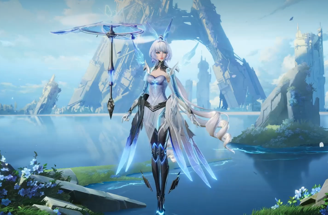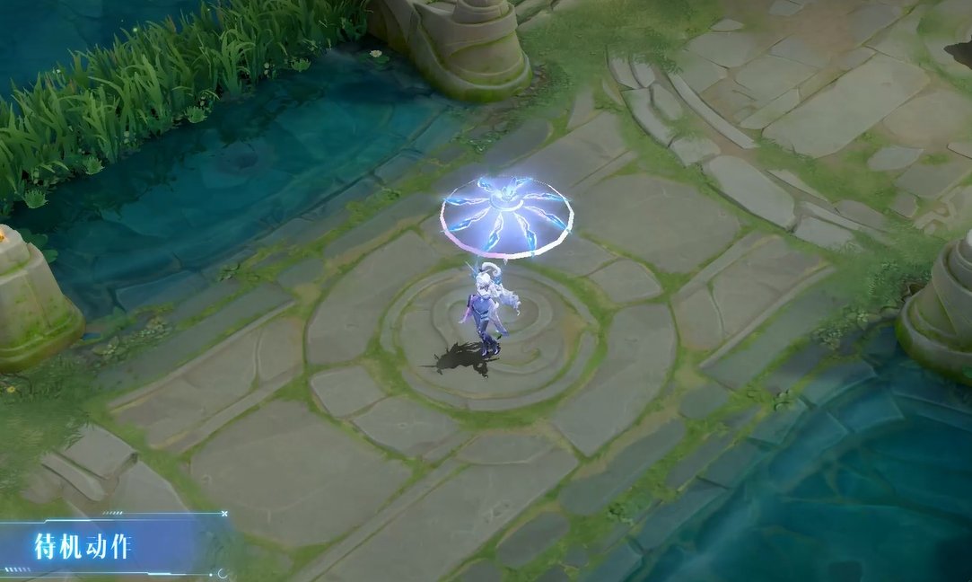 整体以科幻视觉包装,以偏线性结构的科技纹理表现为主。伞作为公孙离技能中的视觉亮点,设计为高概念科技装置。伞的尖端设计了花朵绽放的效果,同时在123技能表现中,具备多段分形变化的动态效果