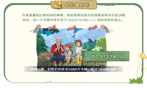 钓鱼、砍树和挖矿是小森村民的传统技能,一直以来就备受大家喜爱~测试期间,村民们总共花了多少慢吞吞的时光在钓鱼呢?森林里又有多少的树木和矿石成为了大家建设家园的原材料?