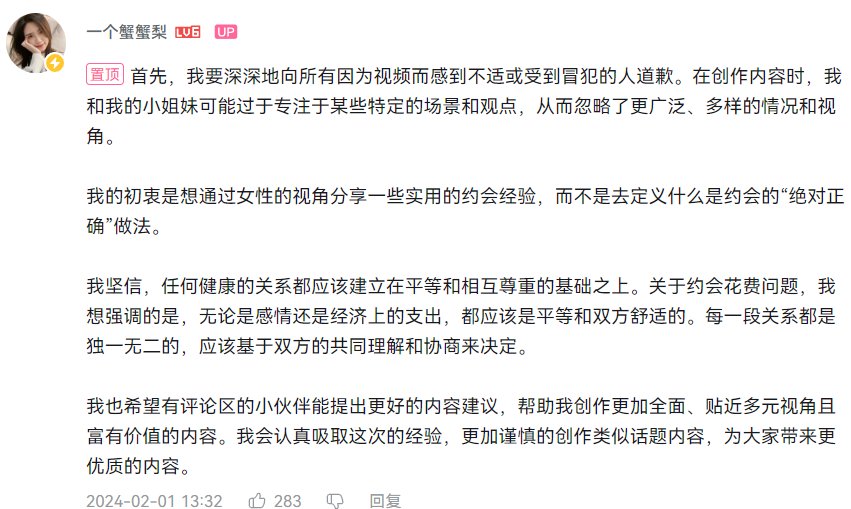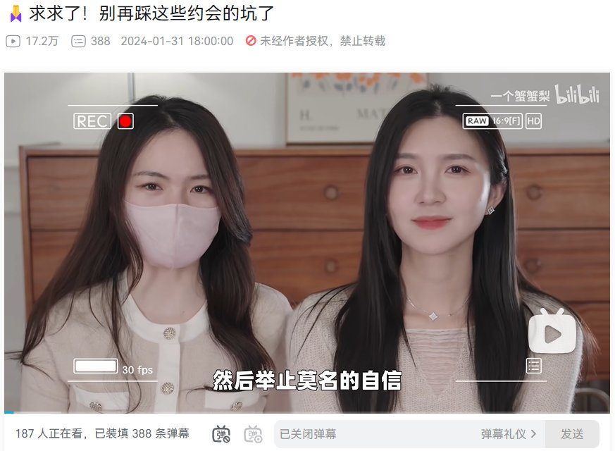 这位UP的ID是:一个蟹蟹梨,是一名美妆穿搭博主;而她翻车的原因,是出了一期视频(还是商单)标题名为:求求了!别再踩这些约会的坑了——主题还是搞说教,让男孩子怎么花钱讨女孩子欢心,怎么“正确”追女孩那一套。