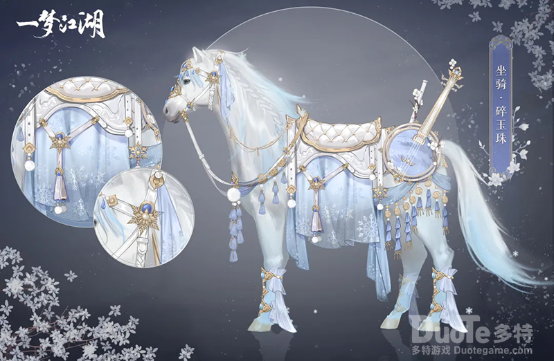 【坐骑上新,踏雪而来】一骑白马踏雪而来,坐骑·碎玉珠通体缀满金饰,奔跑时流苏与蓝色薄纱更显灵动飘逸。马身装点着精致的丝竹乐器,清冷的白梅点缀其中,冬日气息扑面而来~