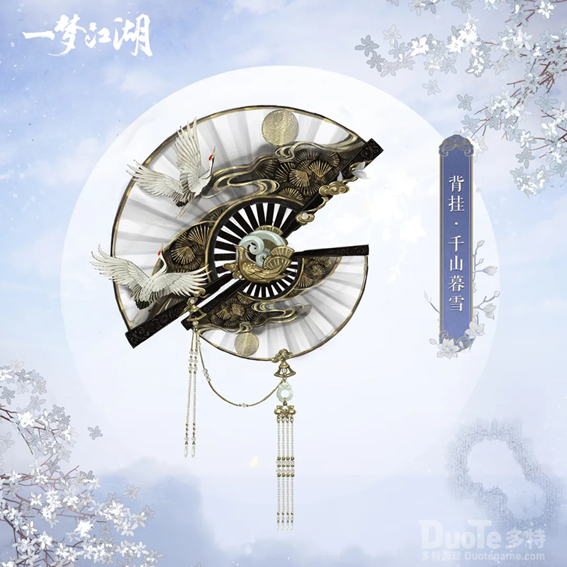 【晴雪主题挂件,灵气十足】背部挂件·千山暮雪是由两把展开的扇子组合而成,白色的扇面上两只白鹤直入云霄,尾端悬挂的珍珠流苏随风摇摆,充满质感的金饰让它潇洒又不失贵气!少侠着它行走于初冬时节的江湖,白鹤入天,流苏轻摇,必然会成为人群中的焦点!