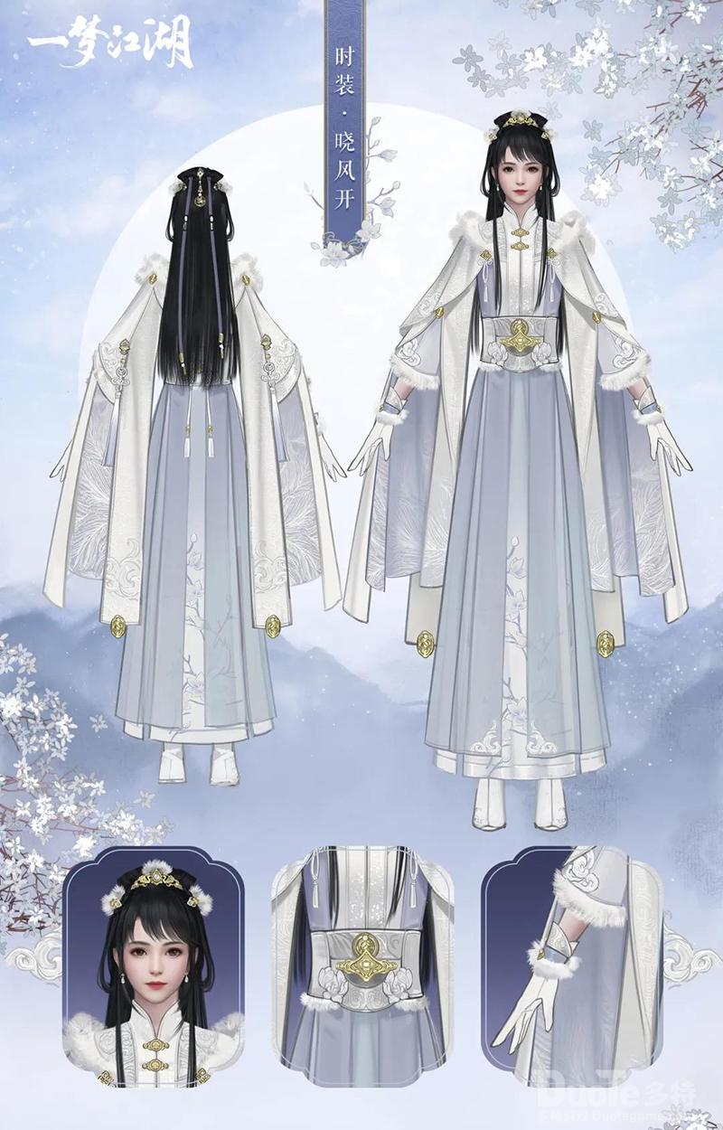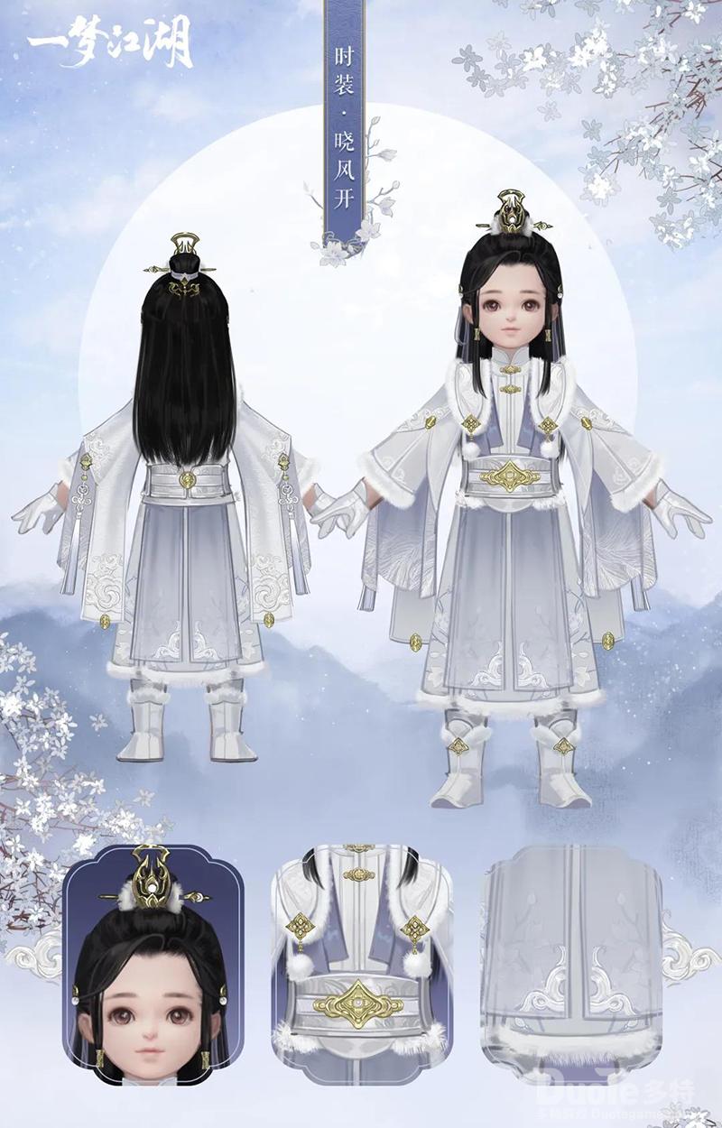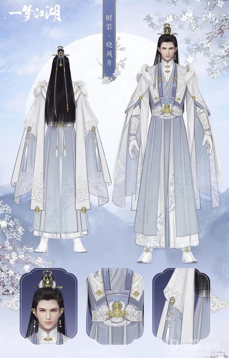 整套晓风开清新淡雅,金色配饰与毛绒围边点缀其中,优雅贵气,好似冰天雪地中走出的仙子,不染俗尘。束起发冠的成男少侠清朗俊逸,微卷的前发增添了一丝浪漫的气息,修身的版型搭配紧束的袖口更显他们身姿挺拔,似位漫步雪景之中的翩翩贵公子。