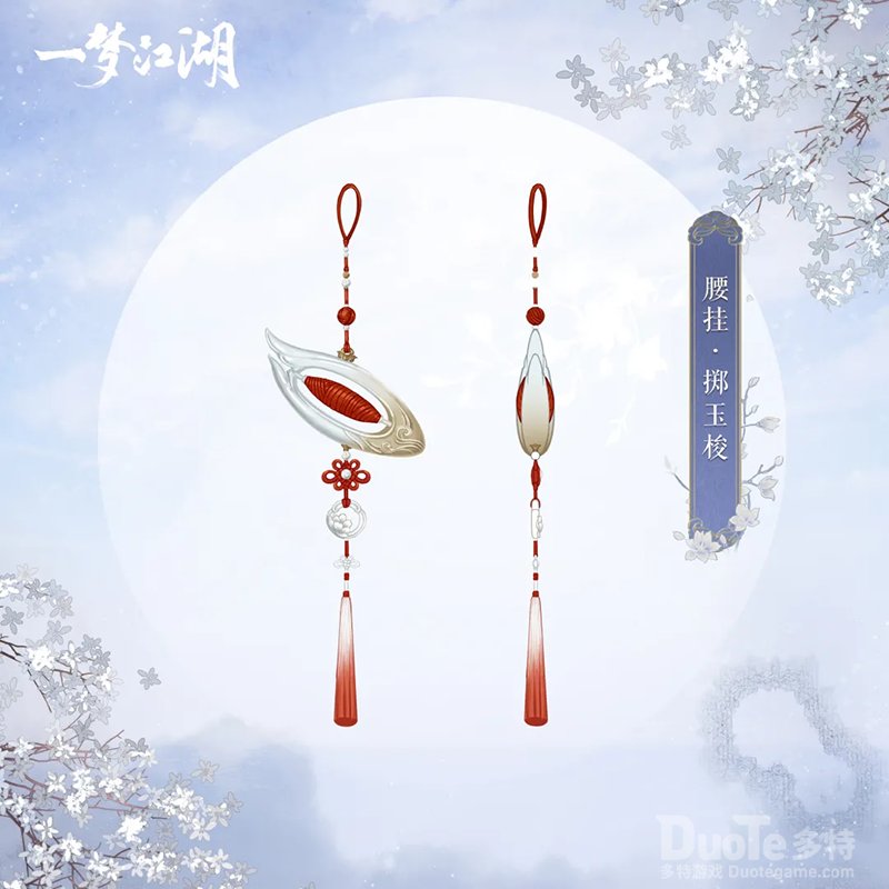 腰部挂件·掷玉梭灵感来源于织布梭,是勤劳美好的象征。中间部分的玉梭,雕刻精致花纹,尾端渐变的流苏更是灵动可爱!