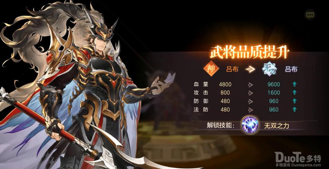 在游戏中,每一个角色在最后都能培养成无双的品阶,并且在属性上找齐。只要和你的阵容适配,在普通的武将都能成为主力。除此之外,游戏还有零损失的换将系统,所有养成资源,如等级、阶级、装备等都可以一键全部继承到新武将身上。