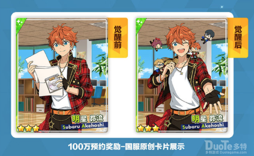 国服原创卡牌奖励百万预约达成,《偶像梦幻祭2》也将为大家带来国服原创卡牌!觉醒前拿着乐谱和唱片的明星昴流帅气又闪亮,觉醒后可爱的Q版Trickstar成员,实在是太萌!