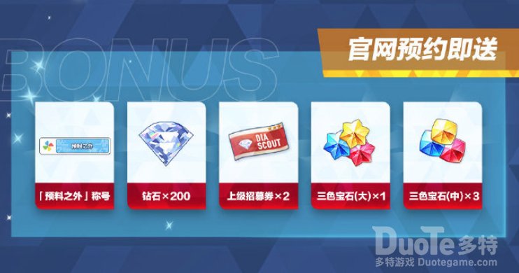 官网预约奖励除了全平台登录奖励,制作人们在官网预约,还将获得官网的预约奖励:【「预料之外」称号+钻石x200+上级招募券x2+三色宝石(大)x1+三色宝石(中)x3】。