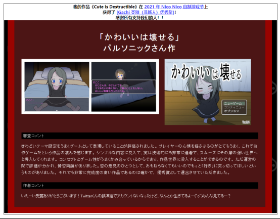 值得一提的是《可爱,能被破坏》曾在2021年的Nico Nico自制游戏节上获得了Gachi类别(非新人)优秀奖。