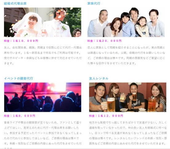 用户每次只需要支付大约2万日元(约1000人民币)就能自主选择想要的家人类型,而且不止家人,有其他方面需求的同样可以出租。