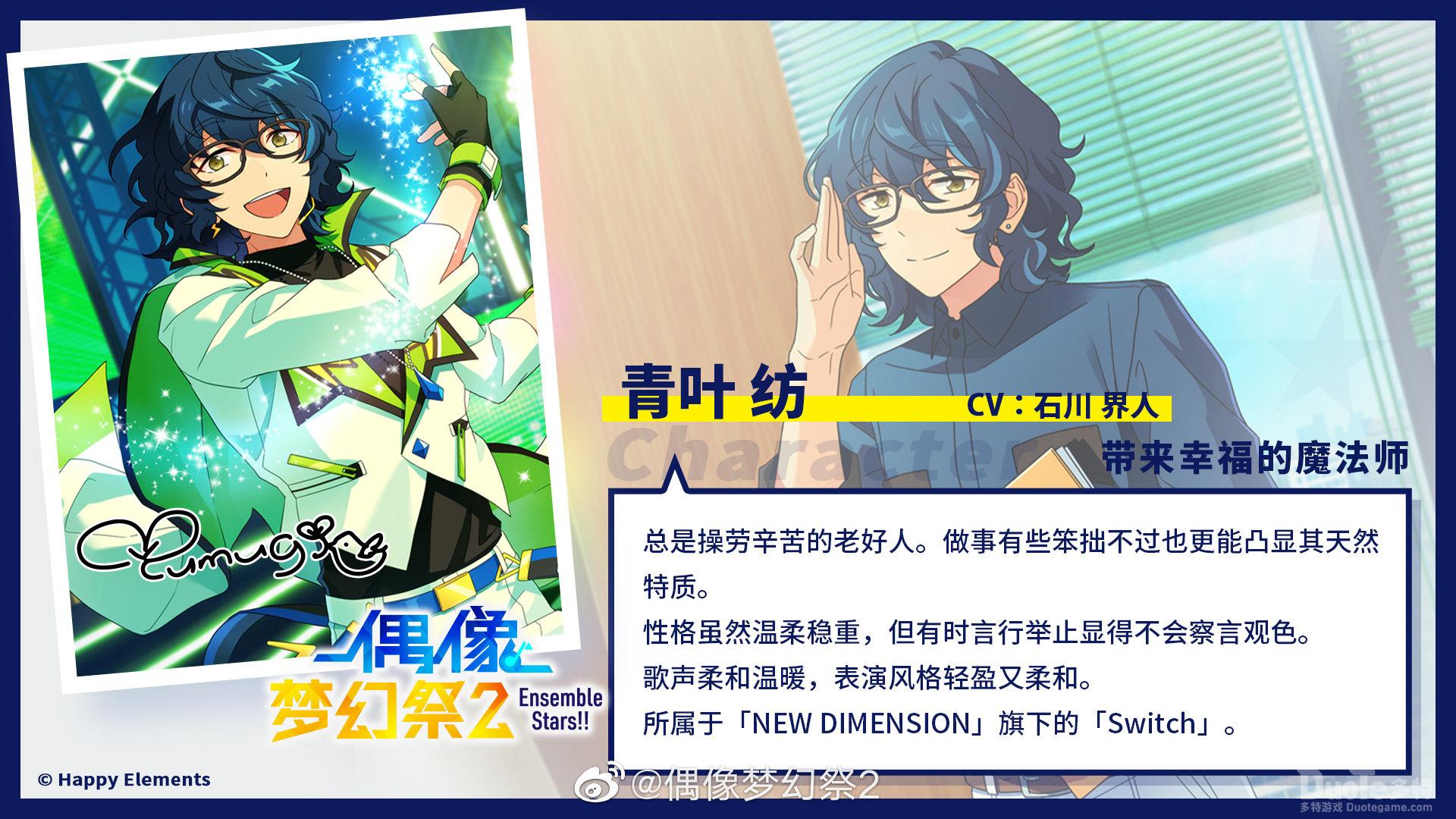 温柔的老好人 青叶纺性格背景青叶纺是一个总是操劳辛苦的老好人,对他人非常温柔体贴。他做事有些笨拙,不过也更能凸显其天然特质。青叶纺的性格十分温柔稳重,但有时他的言行举止显得不会察言观色。目前青叶纺在所属于「NEW DIMENSION」旗下的「Switch」作为一名偶像活跃着,温柔的他也吸引了很多真爱粉丝。