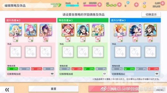 在策略编队界面中,玩家可以自己搭配拥有的学园偶像来设计、改变自己的策略,不同类型的学园偶像产生的策略效果和策略加成各不相同。玩家如何编队和灵活地切换策略将是攻略演唱会的关键之一。