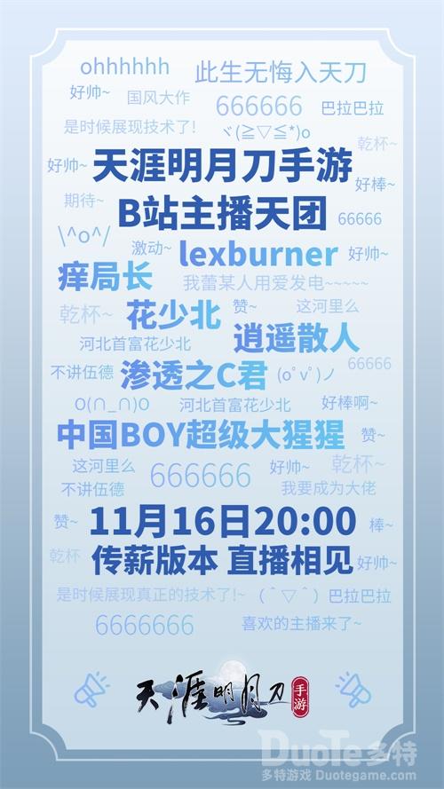 国风主播团带你畅游天刀江湖!继PDD与UZI之后,笑笑、孤影、小楼、韦神4AM.Godv、MIFENGAAA、花少北、Lexburner、渗透之C君、中国BOY超级大猩猩、痒局长等等游戏圈大咖也将加盟天刀手游,直播传薪版本内容!直播间还将掉落众多惊喜好礼,戳此查看直播日程!