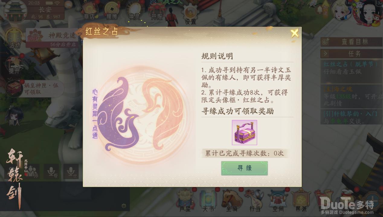 【红丝之占,千里寻缘】以诗会友,云山结缘。双十一将至,少侠是否已邂逅到自己的另一半?《轩辕剑龙舞云山》双十一主题活动“红丝之占”今日甜蜜开启,11月11日-11月24日,前往长安贾半仙处求签,即可根据签文提示寻找今日的有缘人,获得诗文玉佩。