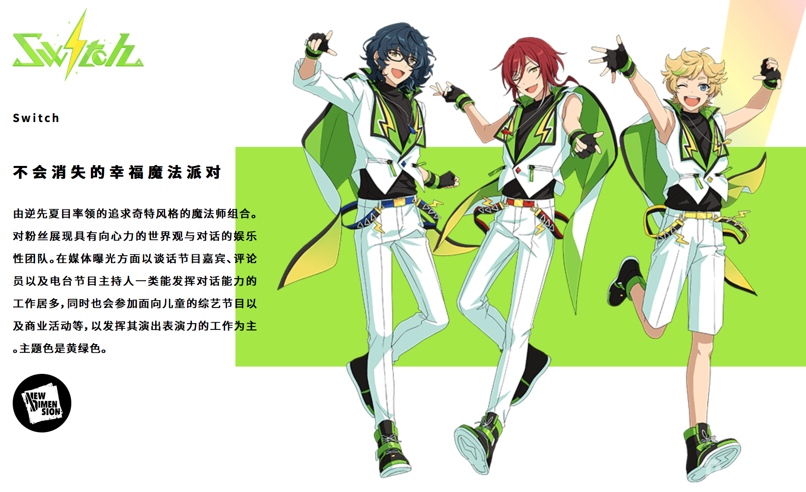 不会消失的幸福魔法派对 魔法师组合Switch音乐组合Switch隶属于事务所NEW DIMENSION,是由逆先夏目率领的追求奇特风格的魔法师组合。Switch对粉丝展现具有向心力的世界观与对话的娱乐性团队,奇特的风格吸引了一大批忠实的粉丝。