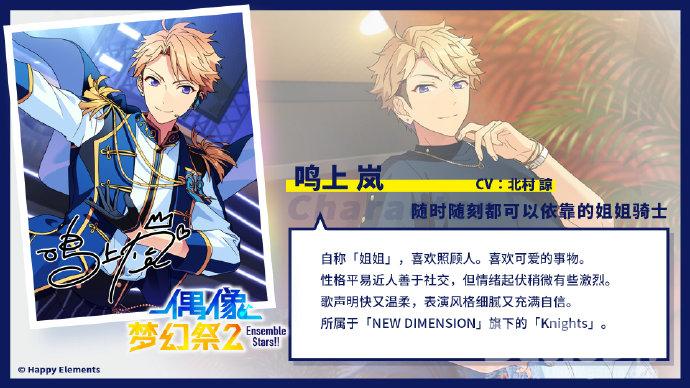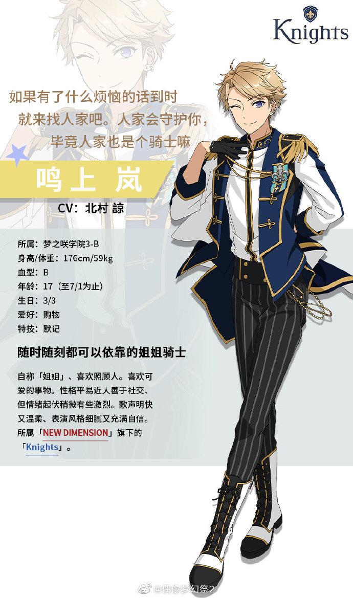 随时随刻都可以依靠的姐姐骑士 鸣上岚档案公开17岁的鸣上岚目前在梦之咲学院3-B班就读,身高176cm,体重59kg,血型B型,生日是3月3日。鸣上岚有着一头浅金色的短发,修剪得十分有型,雪青色的眸子透露温柔和笑意。他的眉眼总是笑眯眯地弯起,看起来十分好相处。鸣上岚的性格平易近人善于社交,但情绪起伏稍微有些激烈。