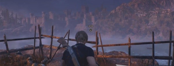 从靶场商人处推门出来,在悬崖边用望远镜远眺湖面,看到湖里的大鱼怪。继续观察还可以看到湖边的船坞和远处的城堡。